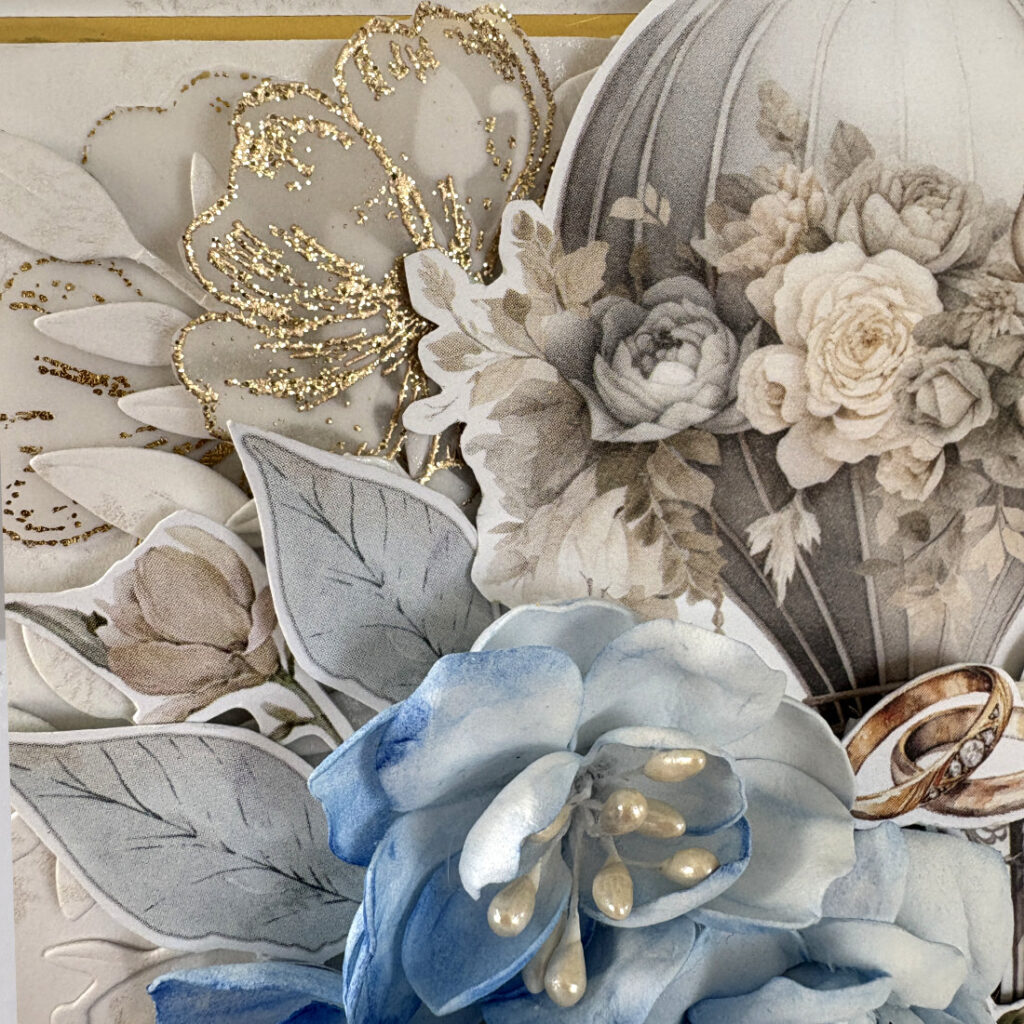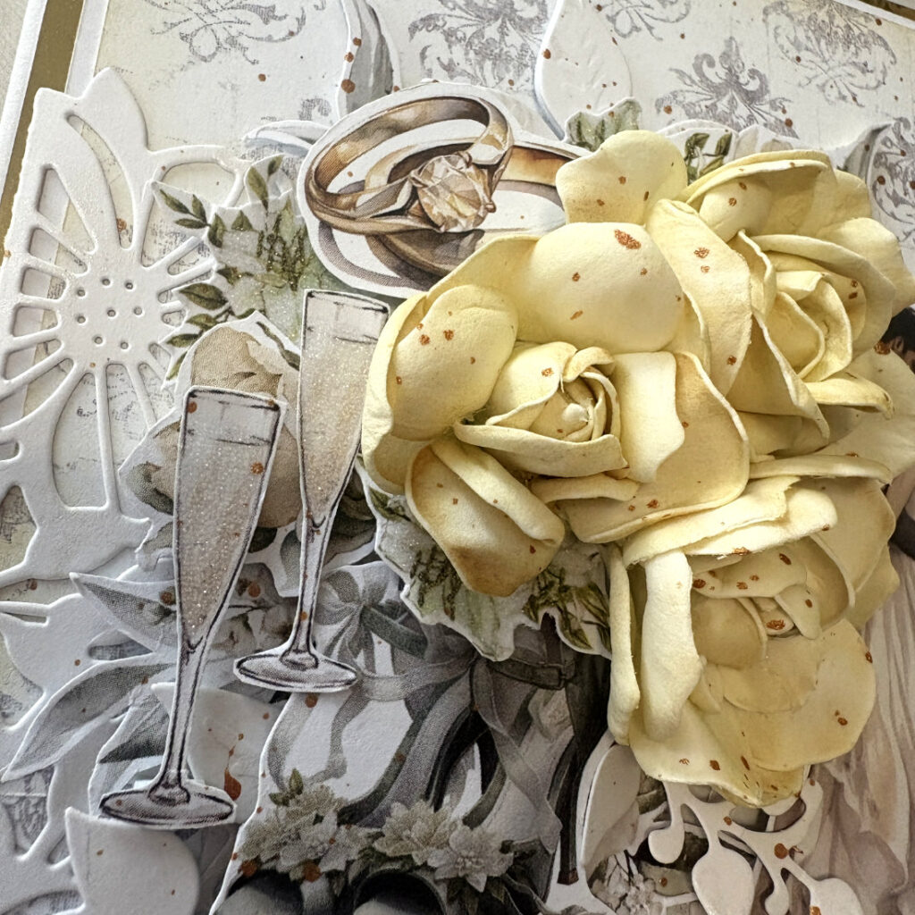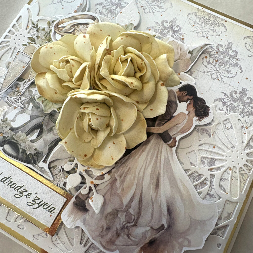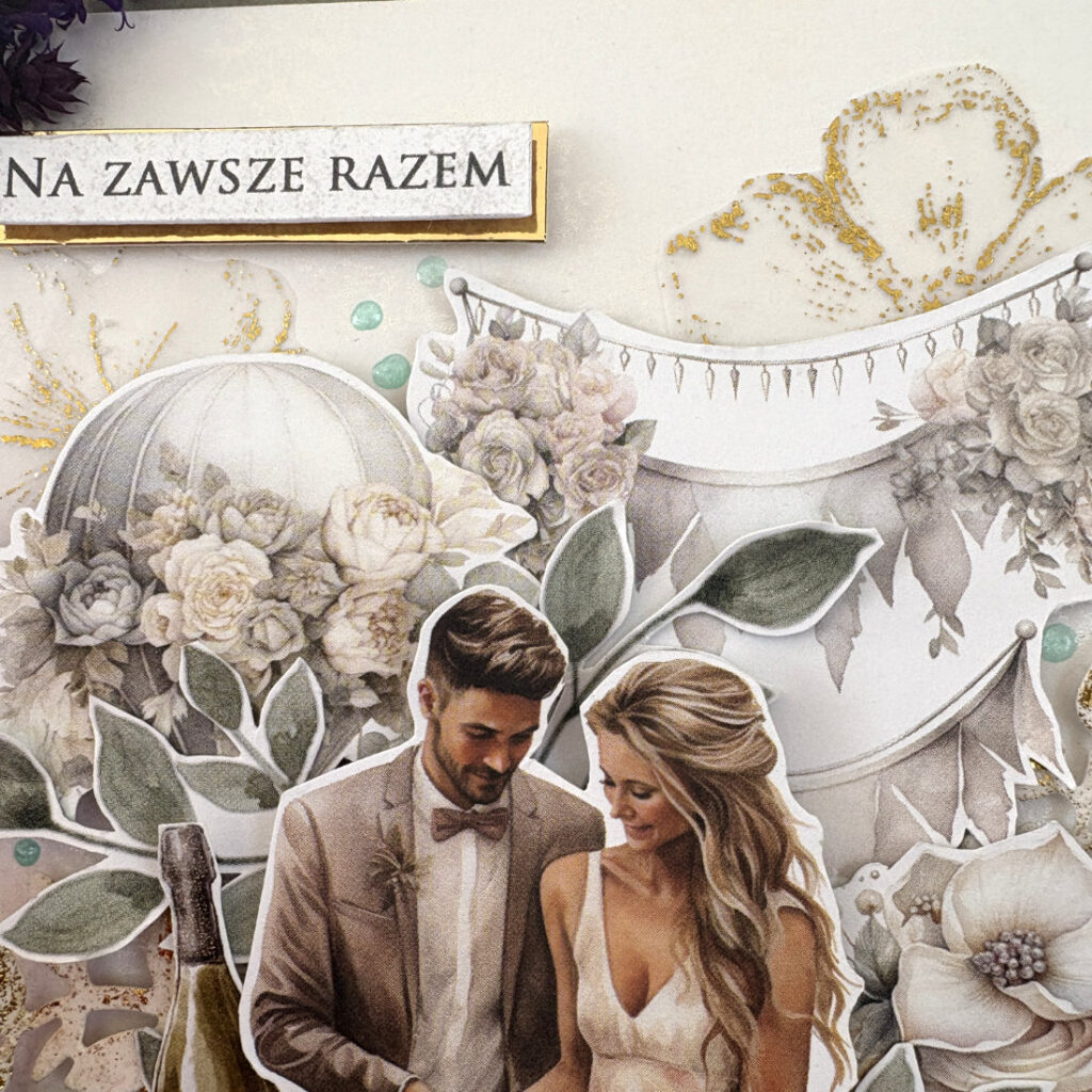 Dominujące barwy to złamana biel, krem, szampańskie złoto oraz zgaszona zieleń, przełamane delikatnymi akcentami pastelowego różu i beżu. Każda kartka to misternie skomponowane dzieło, w którym harmonijnie łączą się papierowe elementy (250 g) i przestrzenne kwiaty z foamiranu, wyglądające jak prawdziwe.