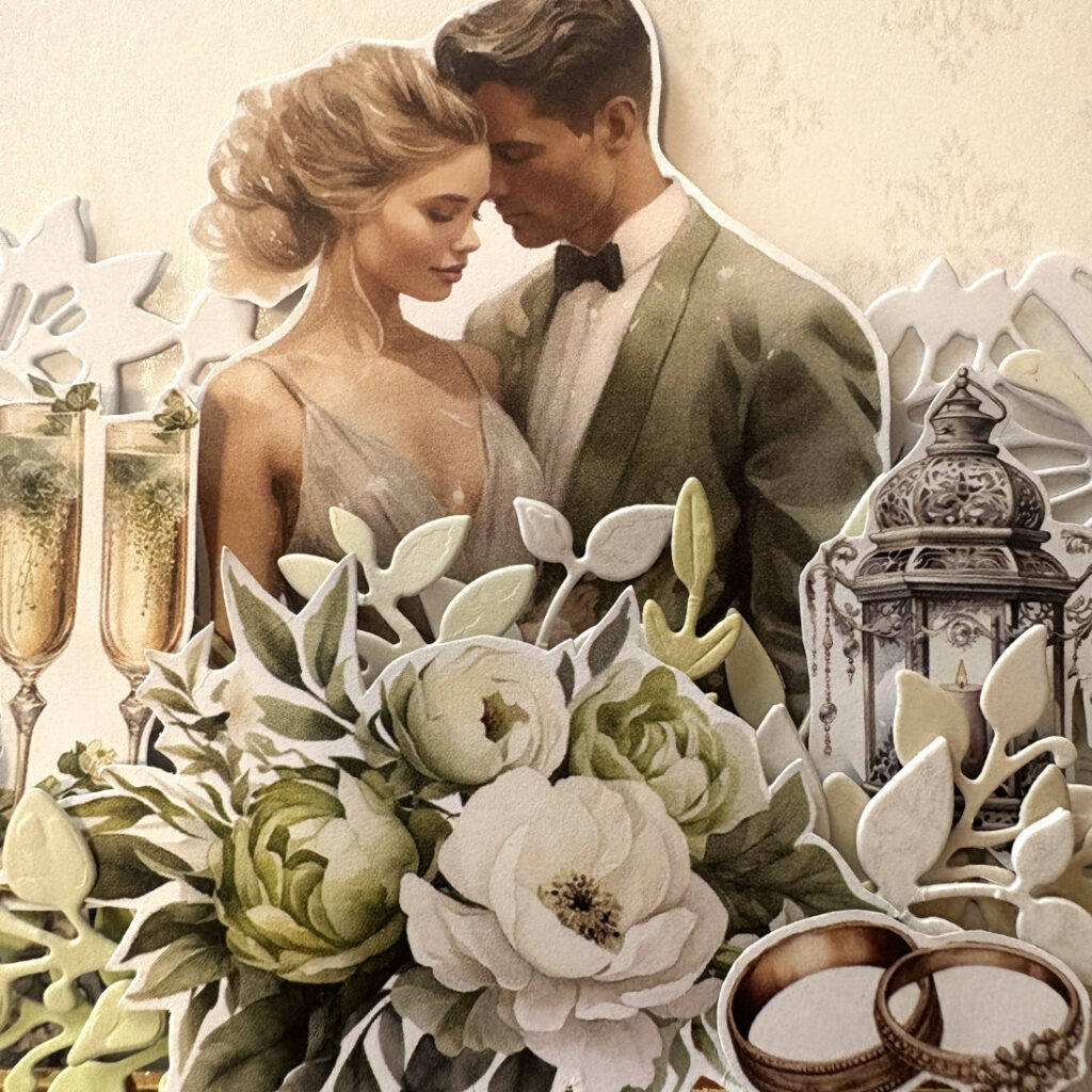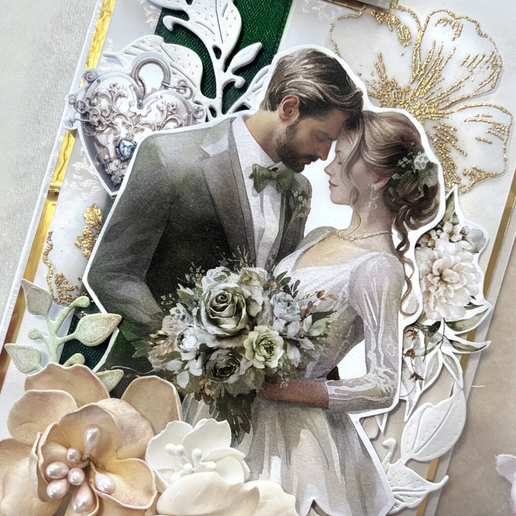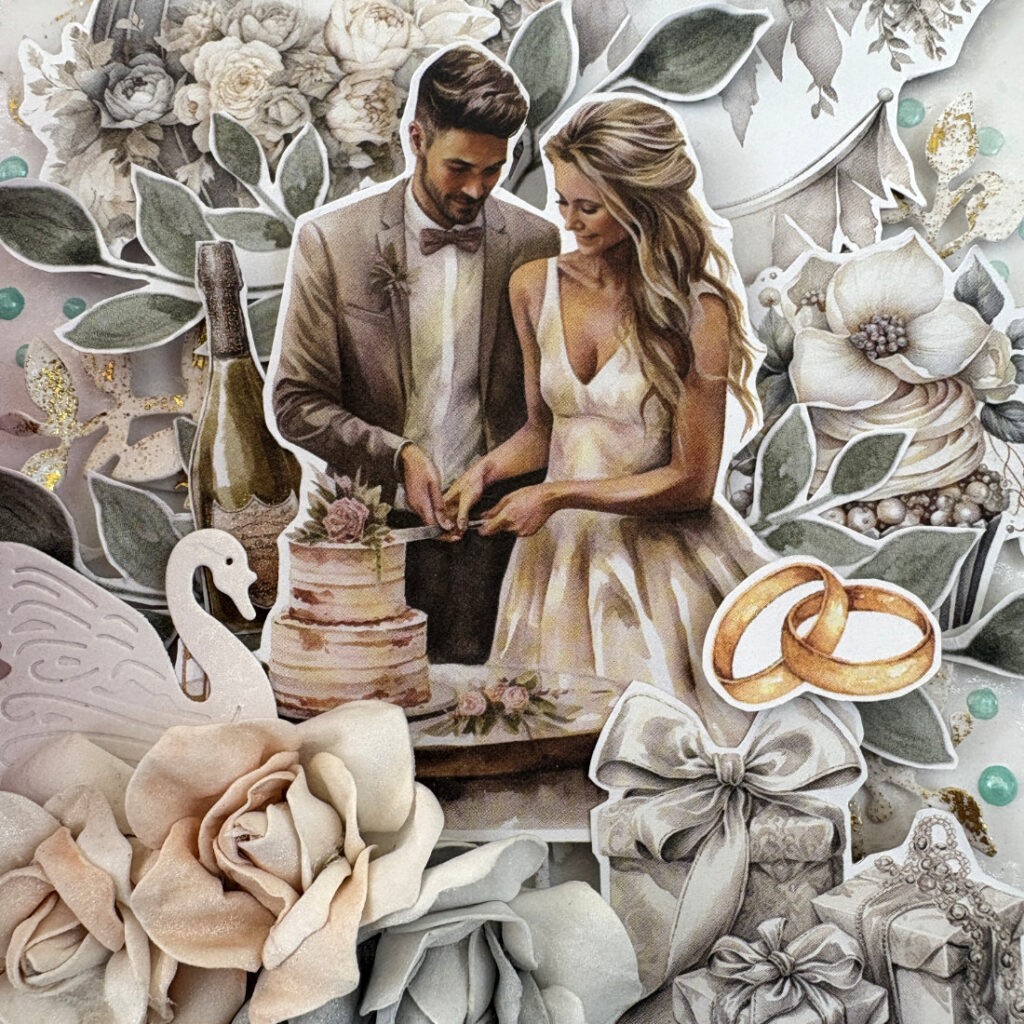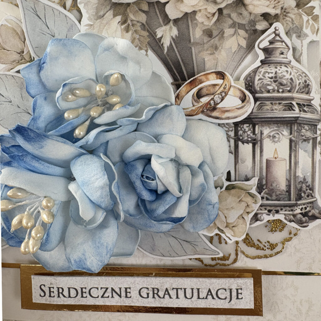 Dominujące barwy to złamana biel, krem, szampańskie złoto oraz zgaszona zieleń, przełamane delikatnymi akcentami pastelowego różu i beżu. Każda kartka to misternie skomponowane dzieło, w którym harmonijnie łączą się papierowe elementy (250 g) i przestrzenne kwiaty z foamiranu, wyglądające jak prawdziwe.