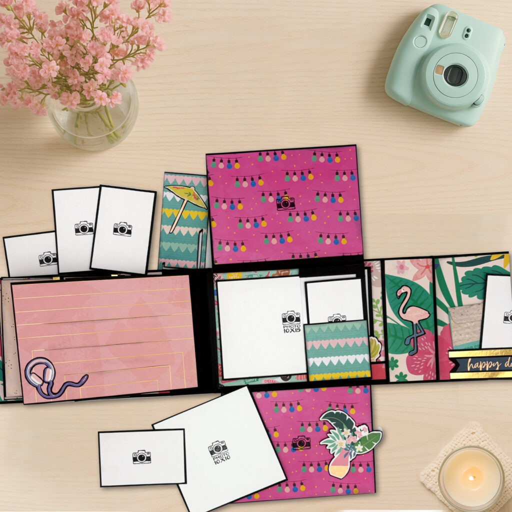 Kolekcja Teenager Travel to barwna, pełna energii i młodzieńczego uroku linia produktów handmade stworzona z myślą o nastolatkach w wieku 9–14 lat. Wykonana na eleganckiej czarnej bazie o gramaturze 250 g, wyróżnia się nietuzinkową formą kartek sztalugowych, które zachwycają nie tylko oryginalnym wyglądem, ale i funkcjonalnością. Kolekcja emanuje dynamizmem oraz feerią żywych kolorów, idealnie oddających radość podróży i nastoletnich marzeń. Każdy album został starannie zaprojektowany tak, aby pomieścić zdjęcia w formacie 10×15 cm, 10×10 cm oraz uwielbiane przez dziewczęta zdjęcia z Instaxa. Oprócz przestrzeni na fotografie, albumy zawierają także urocze dodatki, kolorowe detale i malutkie koperty — idealne na liściki, pamiątki czy dziewczęce sekrety. To nie tylko scrapbooking – to osobisty pamiętnik wspomnień, zamknięty w artystycznej formie. Kolekcja Teenager Travel to doskonały sposób na zatrzymanie najpiękniejszych chwil w wyjątkowy i kreatywny sposób.